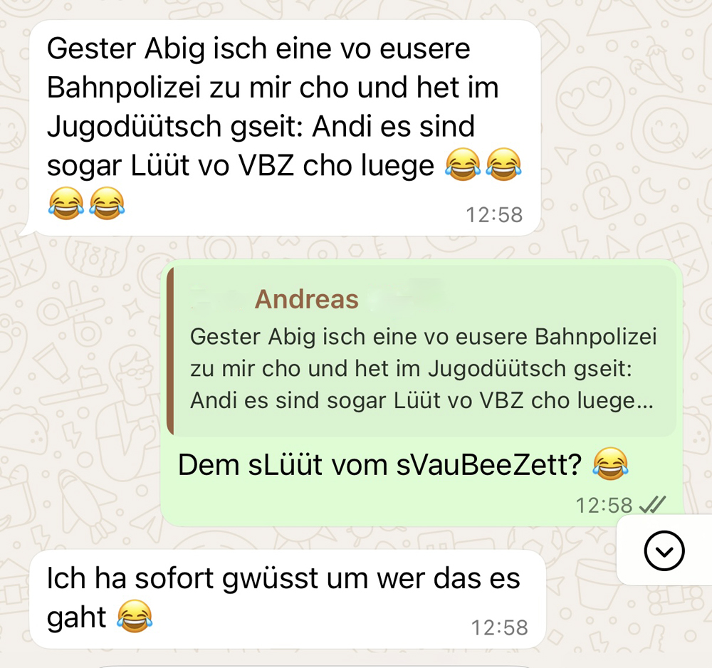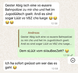 Weise gekonnt vorgetäuscht wird, willkommen zu sein... Dies unterstruch Ramona mit ihrem Einstieg zu einer komplexen Frage mittels "Du bisch immer e gueti Uuskunftsbasis, wenni nümme wiiter chumme". :-)
